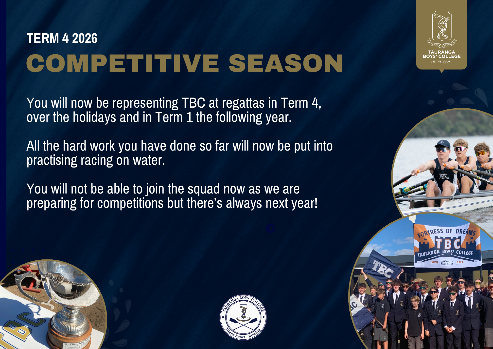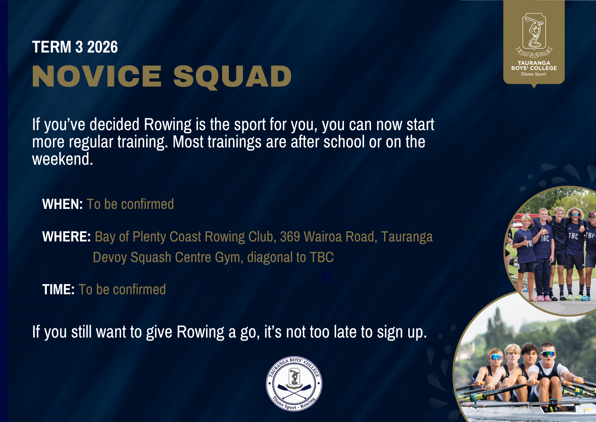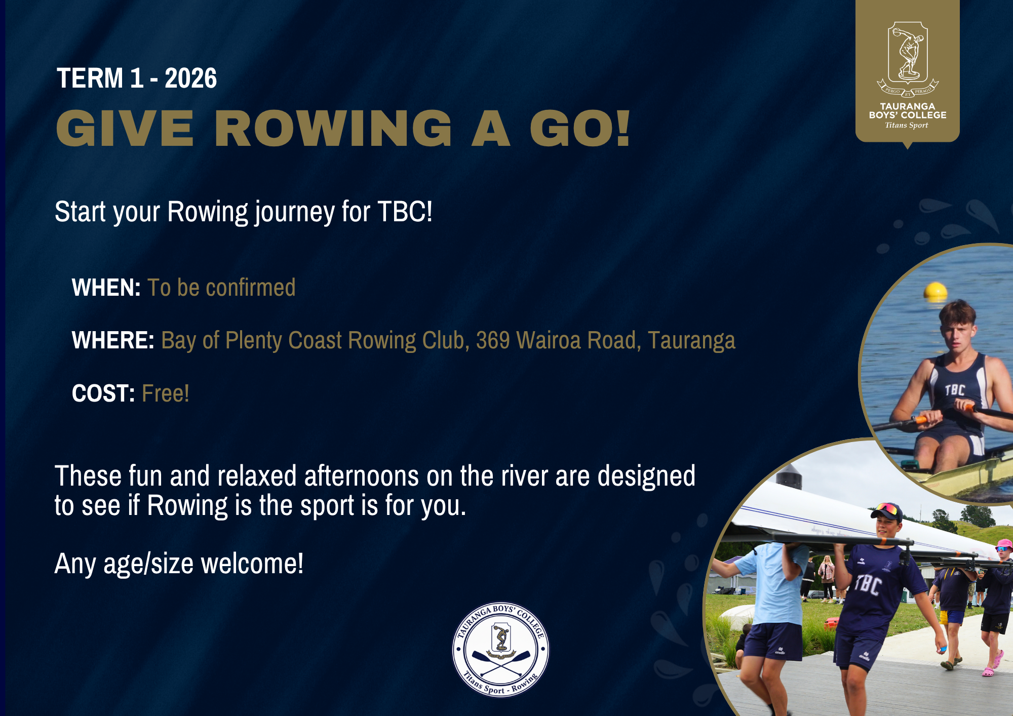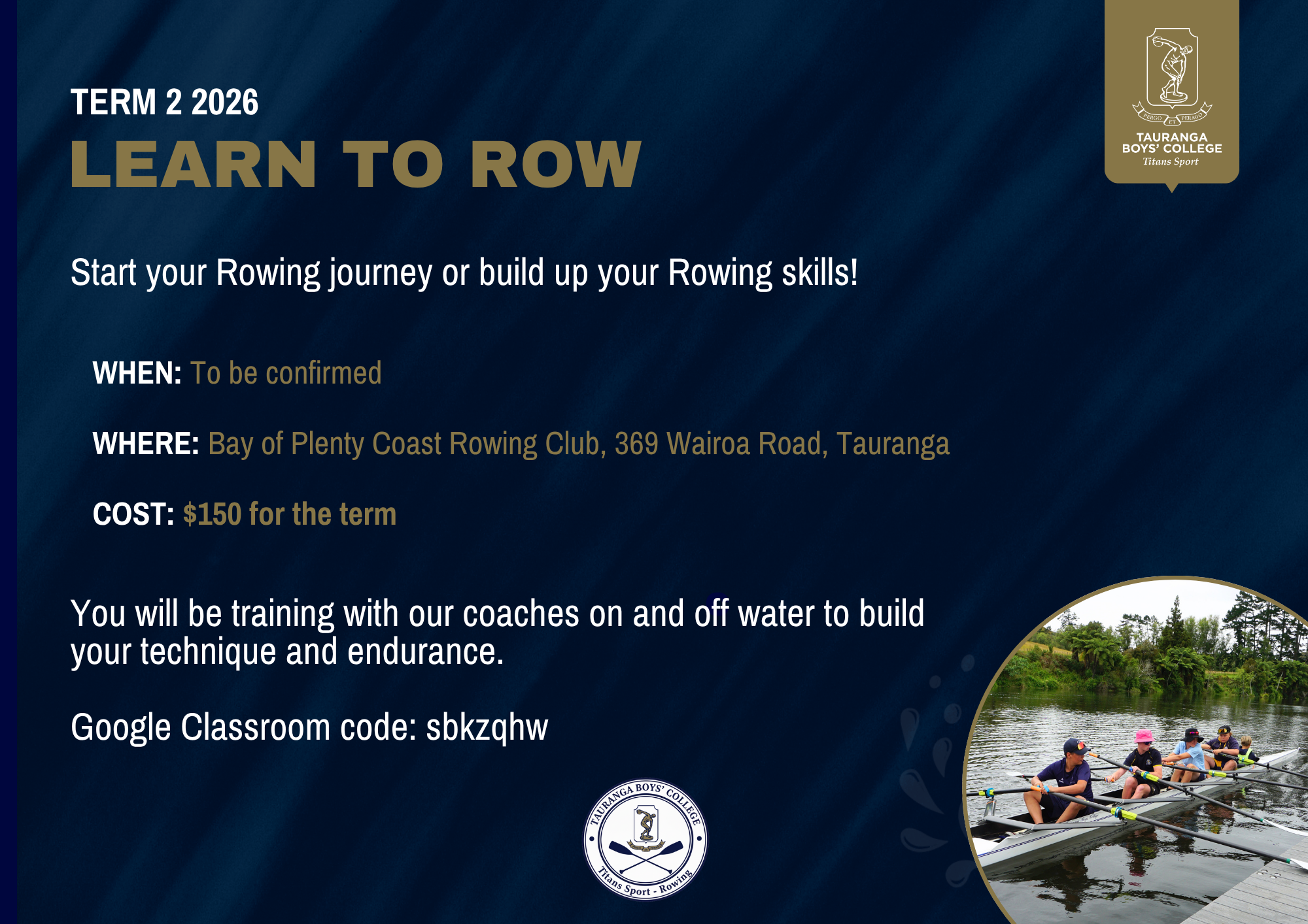 You will required to buy a rowsuit, training shirt, racing cap and school tracksuit.
